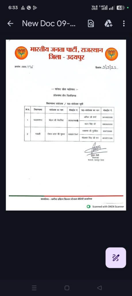 चित्तौड़गढ़ लोकसभा संसदीय क्षेत्र अंतर्गत सांसद खेल महोत्सव 2025 की तैयारियों को लेकर वल्लभनगर विधानसभा क्षेत्र में संयोजक व सह संयोजकों की घोषणा की गई। इसमें भींडर पंचायत समिति के पूर्व उप प्रधान मोहन मेनारिया को संयोजक नियुक्त किया गया है। वहीं, कानोड़ नगर पालिका के पूर्व अध्यक्ष अनिल शर्मा और मदन सिंह कृष्णावत को सह संयोजक की जिम्मेदारी सौंपी गई है।बताया गया कि आगामी दिनों में सांसद खेल महोत्सव का आयोजन होने जा रहा है जिसके लिए खिलाड़ियों का रजिस्ट्रेशन कार्य प्रारंभ हो चुका है।