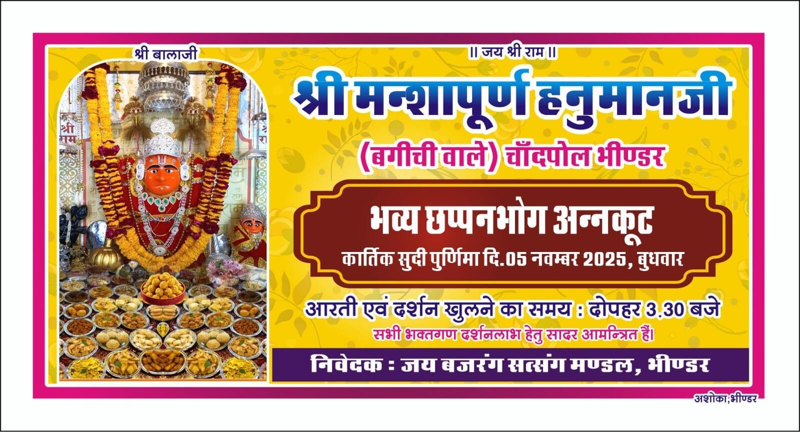 भींडर। भींडर नगर के प्रसिद्ध चांदपोल स्थित श्री मंशापूर्ण हनुमानजी मंदिर ( बगीची वाले) पर कार्तिक सुदी पूर्णिमा बुधवार को भव्य 56 भोग अन्नकूट महोत्सव का आयोजन होगा। दर्शन दोहपर 3:30 बजे खुलेंगे उसके बाद महाआरती होगी और महाप्रसाद का वितरण होगा।दर्शन के लिए भींडर नगर सहित आसपास के श्रद्धालुगण दर्शन के लिए पहुंचेंगे